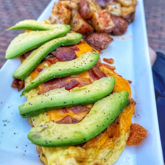 Eggs, grilled smoked applewood thick-cut bacon, freshly sliced avocado, yellow cheddar cheese with your choice of toast and your choice of side item (hash-browns, skillet potatoes or fruit)