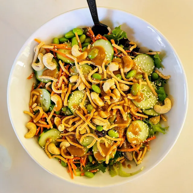 Baby spring mix, edamame, crunchy matchstick carrots, cucumbers, toasted cashews, green onions, sesame seeds, cilantro, and crispy chow mein noodles served with our homemade dressing.