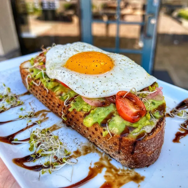 Thinly sliced avocado, sunny-side up egg, pickled red onions, sprouts, balsamic glaze, on rustic sourdough bread.