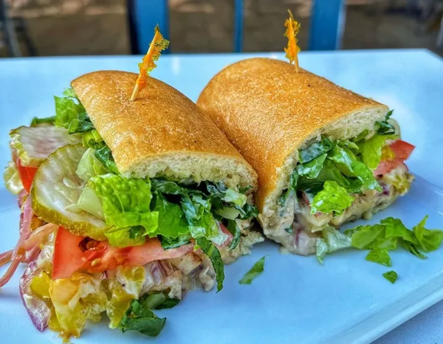 Chopped grilled chicken, grilled onions, banana peppers, shredded romaine, chopped roma tomatoes, garlic aioli, diced pickles, and melted white cheddar cheese on a hoagie roll.