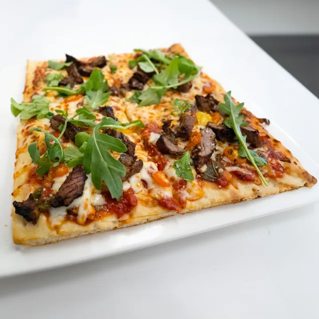 Roasted garlic tomato sauce, mozzarella cheese, Filet mignon, heirloom tomatoes, arugula.
