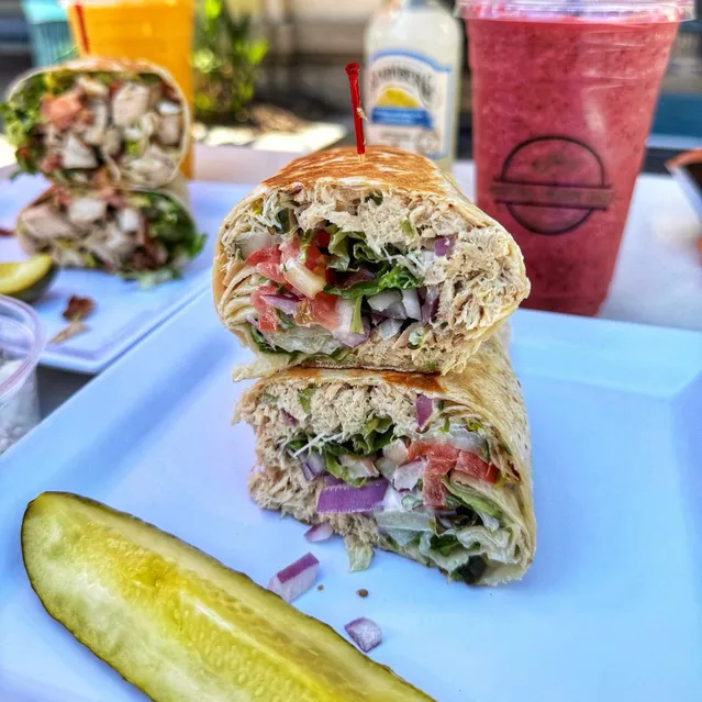 Flour tortilla, mayo, albacore tuna, red onions, tomatoes, pickles, sprouts, spring mix.