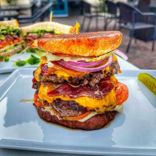 Two 100% rib eye beef patties ground and hand patted on premises, Vermont cheddar cheese, thick cut bacon, Roma tomatoes, thinly sliced onions, Boar’s Dill pickle chips, peppercorn aioli on a toasted and buttered Brioche bun